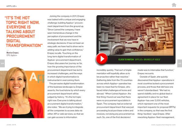 CLICK TO WATCH : ‘ APPLUS + BRANDCLIP VIDEO ’ 145 incredibly quickly . That sort of implementation will hopefully allow us to be proactive rather than reactive .” Gathering data from the 70 countries across which Applus + operates has been no mean feat for Empez , who faced initial challenges at home and abroad . “ When I joined Applus +, the first thing I found out was that there were no procurement specialists in Spain . The company had an external procurement department that was just processing local purchase orders and invoices , not doing any procurement as such . So , one of the first decisions I made was to internalise that function ,” Empez recounts .