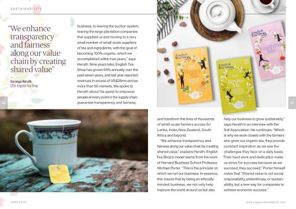 — Suranga Herath , CEO , English Tea Shop business , to leaving the auction system , leaving the large plantation companies that supplied us and moving to a very small number of small-scale suppliers of tea and ingredients , with the goal of becoming 100 % organic , which we accomplished within two years ,” says Herath . Nine years later , English Tea Shop has grown 65 % annually over the past seven years , and last year reported revenues in excess of US $ 28mn across more than 50 markets . We spoke to Herath about his quest to empower people at every point in the supply chain , guarantee transparency and fairness ,
