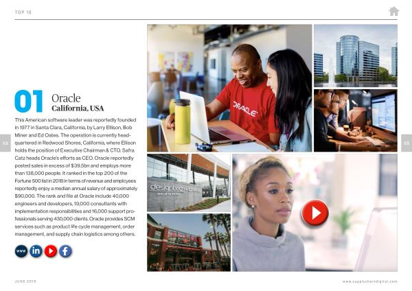 This American software leader was reportedly founded in 1977 in Santa Clara , California , by Larry Ellison , Bob Miner and Ed Oates . The operation is currently headquartered in Redwood Shores , California , where Ellison holds the position of Executive Chairman & CTO . Safra Catz heads Oracle ’ s efforts as CEO . Oracle reportedly posted sales in excess of $ 39.5bn and employs more than 138,000 people . It ranked in the top 200 of the Fortune 500 list in 2018 in terms of revenue and employees reportedly enjoy a median annual salary of approximately $ 90,000 . The rank and file at Oracle include 40,000 engineers and developers , 19,000 consultants with implementation responsibilities and 16,000 support professionals serving 430,000 clients . Oracle provides SCM services such as product life cycle management , order management , and supply chain logistics among others . JUNE 2019