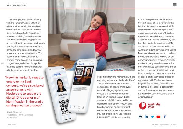 to automate pre-employment identity verification checks , removing the burden of manual processing for HR departments . “ It ’ s been a great success ,” confirms Simongini . “ In just six months we already have 30 customers on board . They ’ re attracted by the fact that our digital services are ISM and PCI compliant , accredited by the Australian federal government ’ s Digital Transformation Agency as a provider of the identity exchange to be rolled out across government services . Now , the market is ready to embrace our solution , which gives consumers the choice of face-to-face or digital identity verification and puts consumers in control of their identity . We ’ ve also signed an agreement with Mastercard to use Digital iD™ as a form of identification in its trial of a broader digital identity service for customers when interacting with other businesses and private organisations .”