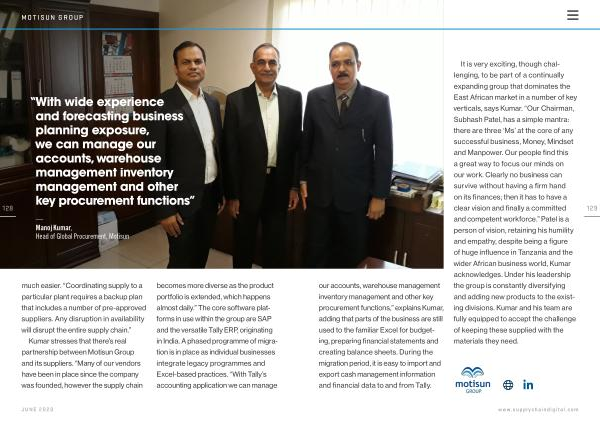 Kumar stresses that there ’ s real partnership between Motisun Group and its suppliers . “ Many of our vendors have been in place since the company was founded , however the supply chain becomes more diverse as the product portfolio is extended , which happens almost daily .” The core software platforms in use within the group are SAP and the versatile Tally ERP , originating in India . A phased programme of migration is in place as individual businesses integrate legacy programmes and Excel-based practices . “ With Tally ’ s accounting application we can manage