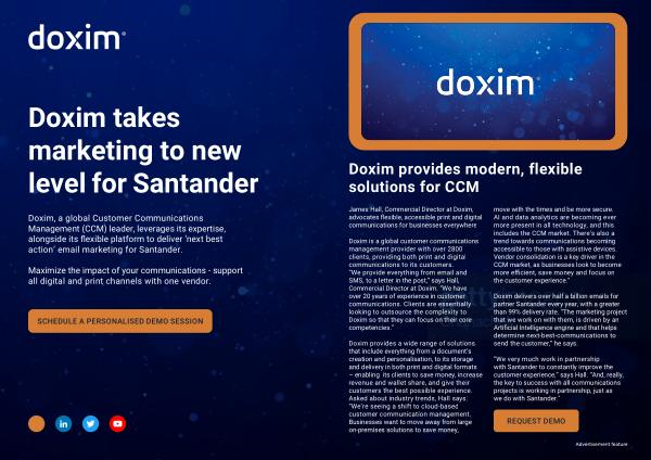 Doxim , a global Customer Communications Management ( CCM ) leader , leverages its expertise , alongside its flexible platform to deliver ‘ next best action ’ email marketing for Santander .