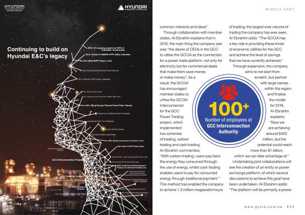 Through collaboration with member states , Al-Ebrahim explains that in 2016 , the main thing the company saw was “ the desire of CEOs in the GCC to utilise the GCCIA as the connection for a power trade platform , not only for electricity but for commercial deals that make them save money or make money ”. As a result , the GCCIA has encouraged member states to utilise the GCCIA interconnector for the GCC Power Trading project , which implemented two schemes of trading , carbon trading and cash trading . Al-Ebrahim commented , “ With carbon trading , users pay back the energy they consumed through the use of energy , whilst cash trading enables users to pay for consumed energy through traditional payment .” This method has enabled the company to achieve 1.3 million megawatts hours