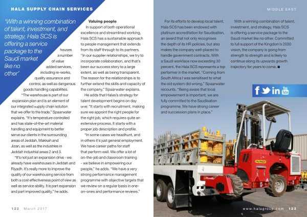For its efforts to develop local talent , Hala SCS has been endowed with platinum accreditation for Saudisation , an award that not only recognises the depth of its HR policies , but also makes the company well-placed to handle government contracts . With a Saudi workface now exceeding 30 percent , the Hala SCS represents a top performer in the market . “ Coming from South Africa I was sensitised to what the old system did wrong ,” Spaarwater recounts . “ Being aware that local empowerment is important , we are fully committed to the Saudisation programme . We have strong career and succession plans in place .”