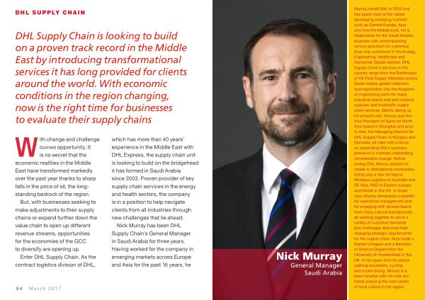 Murray joined DHL in 2003 and has spent most of his career developing emerging markets such as Central Europe , Asia and now the Middle East . He is responsible for the Saudi Arabian business unit ; encompassing service provision for numerous blue chip customers in the Energy , Engineering , Healthcare and Consumer Goods sectors . DHL Supply Chain ’ s services in the country range from the Distribution of Oil Field Supply Materials across Saudi Arabia ; global collection and importation into the Kingdom of engineering parts for major industrial plants and also medical supplies and foodstuffs supply chain services . Before taking up his present role , Murray was the Vice President of Sales for North Asia based in Shanghai and prior to that , the Managing Director for DHL Supply Chain in Hungary and Romania , all roles with a focus on expanding DHL ’ s business presence in markets undertaking considerable change . Before joining DHL Murray started his career in international companies , listing only a few for Mayne Nickless Logistics in Australia and SE Asia , P & O in Eastern Europe and Nestlé in the UK . In these roles Murray developed a passion for operations management and for engaging with diverse teams from many cultural backgrounds , all working together to serve a variety of customer demands and challenges and meet their changing strategic requirements for the supply chain . Nick holds a Master ’ s Degree and a Bachelor of Science Degree from the University of Huddersfield in the UK . In his spare time he enjoys walking mountains , cycling and scuba diving . Murray is a keen traveller with his wife and family enjoying the vast variety of local culture in the region .