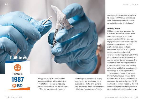 Driving ahead BD has come a long way since the turn of the millennium . Where there was previously just a handful of procurement staff , there is now a highly competent and knowledgeable division comprising almost 200 professionals . Once perhaps considered a cautious , BD ’ s global procurement teams have fully embraced technology to drive both the procurement function and the wider company ’ s top-line performance . The company is now thinking about how it can utilize AI and machine learning , automation and further bleeding-edge technology to improve yet further .