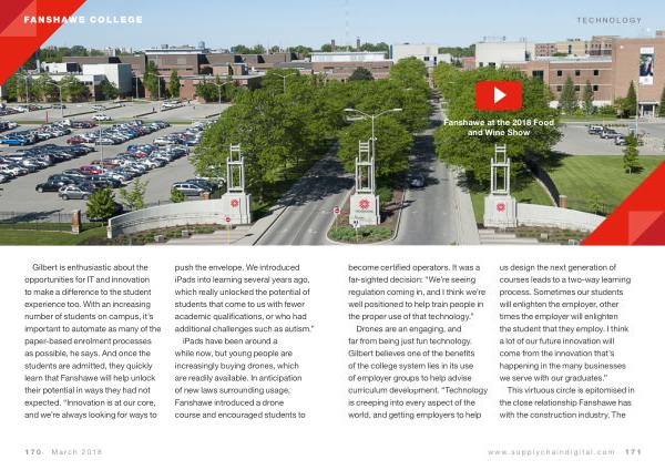 Gilbert is enthusiastic about the opportunities for IT and innovation to make a difference to the student experience too . With an increasing number of students on campus , it ’ s important to automate as many of the paper-based enrolment processes as possible , he says . And once the students are admitted , they quickly learn that Fanshawe will help unlock their potential in ways they had not expected . “ Innovation is at our core , and we ’ re always looking for ways to push the envelope . We introduced iPads into learning several years ago , which really unlocked the potential of students that come to us with fewer academic qualifications , or who had additional challenges such as autism .” iPads have been around a while now , but young people are increasingly buying drones , which are readily available . In anticipation of new laws surrounding usage , Fanshawe introduced a drone course and encouraged students to