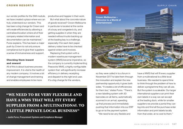 But what about the concrete nature of goods received ? Crown Melbourne in particular is located at the centre of a busy and congested city , and getting supplies in when they are needed without trucks backing up at the loading bay is a challenge , especially if for each item paper delivery notes have to be checked against orders and invoices .