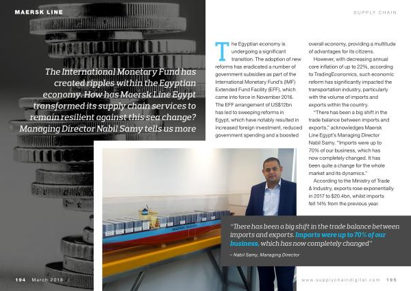 The International Monetary Fund has created ripples within the Egyptian economy . How has Maersk Line Egypt transformed its supply chain services to remain resilient against this sea change ? Managing Director Nabil Samy tells us more
