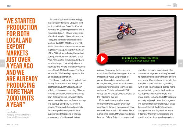 Entering this new market was a challenge from a supply chain perspective as it meant developing a new network from scratch . However , this is a challenge that KTM Group has taken head on . “ Many Asian companies and suppliers are used to working in the automotive segment and they ’ re used to helping manufacture millions of cars every year . Our challenge is to help the supplier understand that by working with a well-known brand , there ’ s more opportunity to grow . In the long term , we hope to increase our more and more bikes .” In doing so , KTM Group is not only helping to meet the burgeoning demand for its motorbikes , it ’ s also helping to boost the local economy and generate employment for more Filipinos . “ Many of our suppliers are small- and medium-sized enterprises