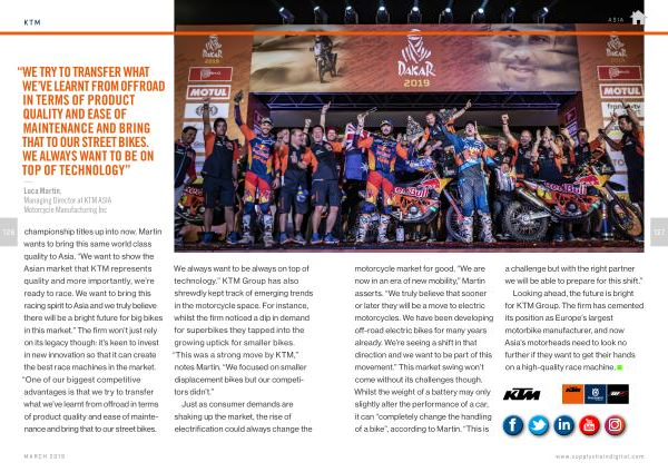 127 motorcycle market for good . “ We are now in an era of new mobility ,” Martin asserts . “ We truly believe that sooner or later they will be a move to electric motorcycles . We have been developing off-road electric bikes for many years already . We ’ re seeing a shift in that direction and we want to be part of this movement .” This market swing won ’ t come without its challenges though . Whilst the weight of a battery may only slightly alter the performance of a car , it can “ completely change the handling of a bike ”, according to Martin . “ This is a challenge but with the right partner we will be able to prepare for this shift .” Looking ahead , the future is bright for KTM Group . The firm has cemented its position as Europe ’ s largest motorbike manufacturer , and now Asia ’ s motorheads need to look no further if they want to get their hands on a high-quality race machine .