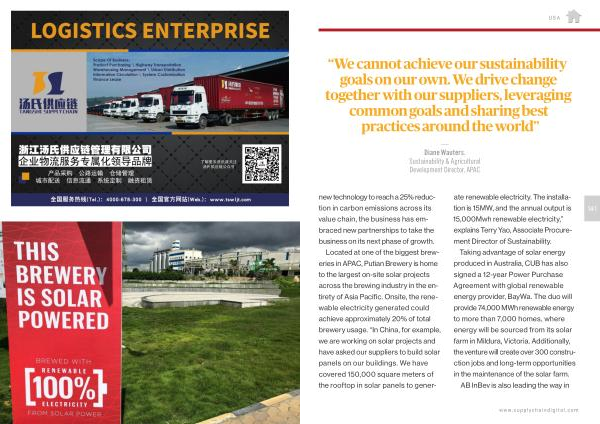 Located at one of the biggest breweries in APAC , Putian Brewery is home to the largest on-site solar projects across the brewing industry in the entirety of Asia Pacific . Onsite , the renewable electricity generated could achieve approximately 20 % of total brewery usage . “ In China , for example , we are working on solar projects and have asked our suppliers to build solar panels on our buildings . We have covered 150,000 square meters of the rooftop in solar panels to generate renewable electricity . The installation is 15MW , and the annual output is 15,000Mwh renewable electricity ,” explains Terry Yao , Associate Procurement Director of Sustainability .