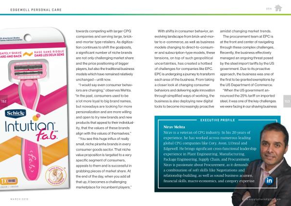 Nirav Mehta Nirav is a veteran of CPG industry . In his 20 years of experience , he has worked across numerous leading global CPG companies like Coty , Avon , L ’ Oreal and Edgewell . He brings significant cross-functional leadership experience in Plant Engineering , Manufacturing , Package Engineering , Supply Chain , and Procurement . Nirav is passionate about Procurement , as it demands a combination of soft skills like Negotiations and relationship building , as well as sound business acumen , financial skills , macro-economics , and category expertise .