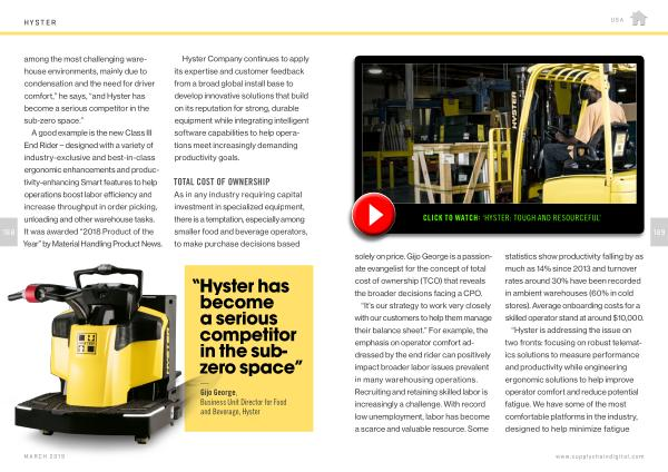 “ It ’ s our strategy to work very closely with our customers to help them manage their balance sheet .” For example , the emphasis on operator comfort addressed by the end rider can positively impact broader labor issues prevalent in many warehousing operations . Recruiting and retaining skilled labor is increasingly a challenge . With record low unemployment , labor has become a scarce and valuable resource . Some statistics show productivity falling by as much as 14 % since 2013 and turnover rates around 30 % have been recorded in ambient warehouses ( 60 % in cold stores ). Average onboarding costs for a skilled operator stand at around $ 10,000 . “ Hyster is addressing the issue on two fronts : focusing on robust telematics solutions to measure performance and productivity while engineering ergonomic solutions to help improve operator comfort and reduce potential fatigue . We have some of the most comfortable platforms in the industry , designed to help minimize fatigue