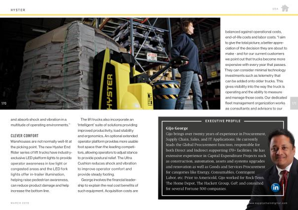 The lift trucks also incorporate an ‘ Intelligent ’ suite of solutions providing improved productivity , load stability and ergonomics . An optional extended operator platform provides more usable foot space than the leading competitors , allowing operators to adjust stance to provide postural relief . The Ultra Cushion reduces shock and vibration to improve operator comfort and provide steady footing .