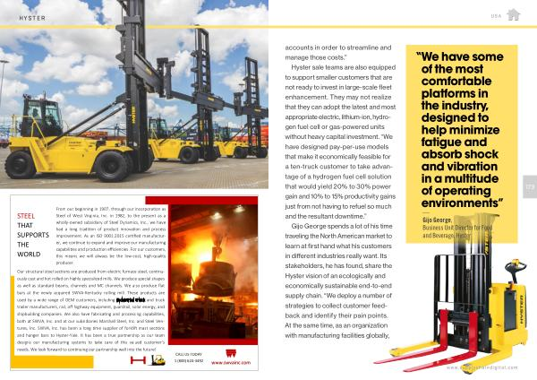 Our structural steel sections are produced from electric furnace steel , continuously cast and hot rolled on highly specialized mills . We produce special shapes as well as standard beams , channels and MC channels . We also produce flat bars at the newly acquired SWVA-Kentucky rolling mill . These products are used by a wide range of OEM customers , including industrial truck and truck trailer manufacturers , rail , off highway equipment , guardrail , solar energy , and shipbuilding companies . We also have fabricating and processing capabilities , both at SWVA , Inc . and at our subsidiaries Marshall Steel , Inc . and Steel Ventures , Inc . SWVA , Inc . has been a long time supplier of forklift mast sections and hanger bars to Hyster-Yale . It has been a true partnership as our team designs our manufacturing systems to take care of this valued customer ’ s needs . We look forward to continuing our partnership well into the future !