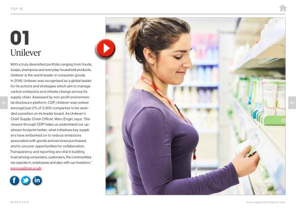 With a truly diversified portfolio ranging from foods , soaps , shampoos and everyday household products , Unilever is the world leader in consumer goods . In 2018 , Unilever was recognised as a global leader for its actions and strategies which aim to manage carbon emissions and climate change across its supply chain . Assessed by non-profit environmental disclosure platform , CDP , Unilever was ranked amongst just 2 % of 3,300 companies to be awarded a position on its leader board . As Unilever ’ s Chief Supply Chain Officer , Marc Engel , says : “ Disclosure through CDP helps us understand our upstream footprint better , what initiatives key suppliers have embarked on to reduce emissions associated with goods and services purchased , and to uncover opportunities for collaboration . Transparency and reporting are vital in building trust among consumers , customers , the communities we operate in , employees and also with our investors .” www . unilever . co . uk