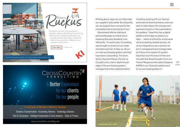 Moorehead affirms that each partnership plays a critical role in ensuring Success Academy runs efficiently . “ CrossCountry Consulting was brought on board as our implementation partner to help us roll out our new purchasing system , and they have been outstanding . The team , led by Harpreet Narula , Partner at CrossCountry , had in-depth knowledge of the purchasing system , managed the entire implementation including working with our internal and external technical teams , and was able to help reduce the change management impact on the organisation ,” he explains . “ OpenText has a digital platform that helps us protect our data — which is critical for us because we ’ re protecting student privacy . All of our integrations use a partner for error management and manage data as it flows from system to system . OpenText is at the heart of that and has data that flows through it from our Human Resource Information Systems ( HRIS ) to our financial systems and to our purchasing platform .”