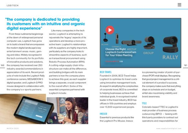 From these rudimental beginnings at the dawn of widespread personal computer use , Logitech has gone on to build a brand that encompasses the modern digital landscape ’ s key entertainment areas : music , gaming and video . Widely recognised in the tech community for its portfolio of innovative products and solutions , the company has received over 250 industry awards / commendations in appreciation of its work . Recent products of note include the Logitech Rally conference camera , MEGABOOM 3 digital speaker , and Logitech G PRO mouse designed in collaboration with the company ’ s e-sports partners . sector , Logitech is attempting to rejuvenate the ‘ legacy ’ aspects of its operations and develop a more proactive team . Logitech ’ s relationships with its suppliers are highly important , particularly as the company looks to streamline aspects of business , such as transactional procurement using Robotic Process Automation ( RPA ). A cutting-edge supply chain infrastructure can make all the difference , and building bridges with its main partners is how the company plans to achieve this goal , as each supplier brings a separate , crucial component to the overall effort . Some of the essential companies partnered with Logitech include :