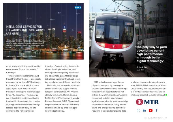 “ Theoretically , customers could travel from their home — a property managed by us , to an MTR railway , to their office block which is managed by us , have lunch or meet friends in a shopping mall managed by us ,” he expands . This synergy not only retains custom and builds trust within the market , but creates an integrated society where looselyrelated aspects of daily life are connected to run seamlessly together . Consolidating the supply chain of multiple industries , and thinking macroscopically about society as a whole gives MTR an edge in building customer trust and retaining loyalty across different markets .