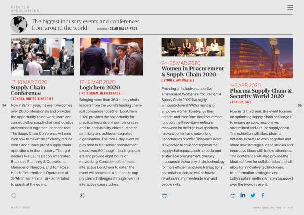 leaders from the world ’ s leading chemical companies together , LogiChem 2020 provides the opportunity for practical insights on how to increase end-to-end visibility , drive customercentricity and achieve integrated digitalisation . The three-day event will play host to 120 senior procurement executives , 50 thought-leading speakers and provide eight hours of networking . Considered the “ most interactive LogiChem to date ,” the event will showcase solutions to supply chain challenges through over 60 interactive case studies . MARCH 2020
