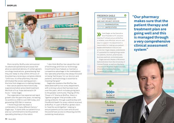 Vice President of IT , ensures that the IT infrastructure at BioPlus is reliable , cost effective , secure , and easy to support . His department is responsible for making sure patient health information is secure and protected . Gagle deeply understands IT ’ s potential for making things easier for patients , doctors , pharmacists , business partners , and employees .