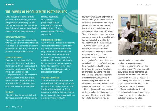 With the team now in a stable function , members have been reaching out to other organisations to enable the sharing of best practices . This has led to KAUST working other Saudi institutions and organisations , such as Saudi Aramco , King Abdullah Medical City and King Fahd University of Petroleum and Minerals ( KFUPM ). “ We see the next stage of our development is to encourage our suppliers to trade similarly with other Saudi companies , as we are often the sole client they have here ,” says Harvey .