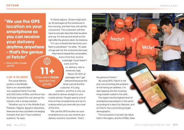 SUPPLY MIDDLE CHAIN EAST the genius of Fetchr .” By using GPS , Fetchr is not only circumventing the problem of not having an address , it is also tapping into the mushrooming mobile market in the UAE .