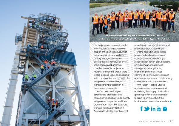 “ At the same time and within our Australian business , we ’ re in the process of developing a reconciliation action plan , finalising an indigenous engagement strategy and strengthening relationships with our local communities . Procurement is just one area where we can create strong connections with communities .” With Fulton Hogan ’ s unique and successful business model , optimizing the supply chain offers great opportunity and challenge to drive value throughout the business and to our shareholders .