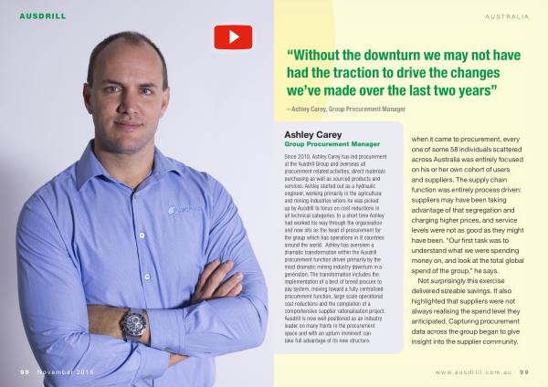 Since 2010 , Ashley Carey has led procurement at the Ausdrill Group and overseas all procurement related activities , direct materials purchasing as well as sourced products and services . Ashley started out as a hydraulic engineer , working primarily in the agricultural and mining industries where he was picked up by Ausdrill to focus on cost reductions in all technical categories . In a short time Ashley had worked his way through the organisation and now sits as the head of procurement for the group which has operations in 8 countries around the world . Ashley has overseen a dramatic transformation within the Ausdrill procurement function driven primarily by the most dramatic mining industry downturn in a generation . The transformation includes the implementation of a best of breed procure to pay system , moving toward a fully centralised procurement function , large scale operational cost reductions and the completion of a comprehensive supplier rationalisation project . Ausdrill is now well positioned as an industry leader on many fronts in the procurement space and with an upturn imminent can take full advantage of its new structure . when it came to procurement , every one of some 58 individuals scattered across Australia was entirely focused on his or her own cohort of users and suppliers . The supply chain function was entirely process driven : suppliers may have been taking advantage of that segregation and charging higher prices , and service levels were not as good as they might have been . “ Our first task was to understand what we were spending money on , and look at the total global spend of the group ,” he says .