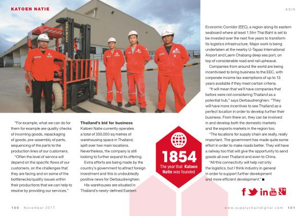 “ The locations for supply chain are really , really important . The government has made quite some effort in order to make roads better . They will have a railway too that will give the opportunity to send goods all over Thailand and even to China . “ All this connectivity will help not only the logistics , but I think industry in general in order to support further development and more efficient development .” www . supplychaindigital . com 101