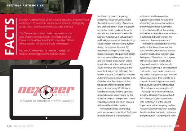 ASIA facilitated by cloud computing platforms . These solutions enable the real-time computing of products and process data in order to support predictive quality and maintenance models . Another area of interest for Nexteer Automotive is virtual reality , as Rodriguez says that the technology could shorten manufacturing system design development cycles . By allowing the company to virtually approve aspects of equipment design such as material flow , ergonomics and workplace organisation before physical construction , virtual reality could enhance the efficiency of the manufacturing chain . Although the cost of labour in China is low , Nexteer Automotive also believes that Co-Bots ( Collaborative Robots ) could also be a cost-effective solution to the automotive industry . Co-Bots can collaborate safely with the operator , undertake work usually done by the operator , and can also perform critical inspection operations when coupled with an artificial vision system .