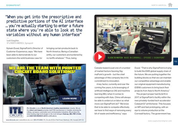 Sylvain Duval , SigmaPoint ’ s Director of Customer Experience , says : “ We have been able to demonstrate to our customers the solid business case for bringing certain products back to North America . Being a Canadian entity , our customers are burdened by no tariffs whatever .” Thus , being