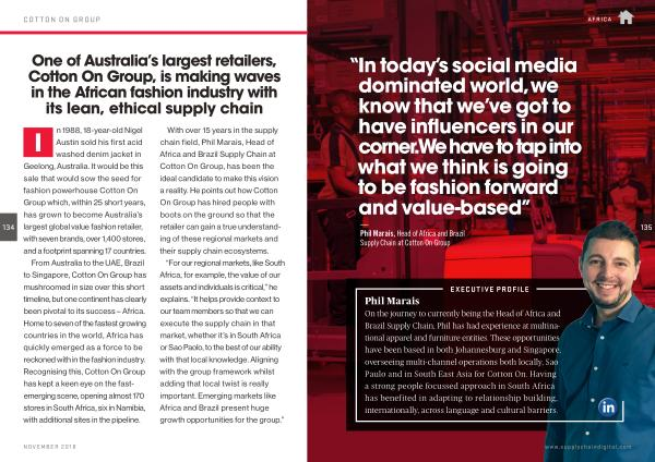 With over 15 years in the supply chain field , Phil Marais , Head of Africa and Brazil Supply Chain at Cotton On Group , has been the ideal candidate to make this vision a reality . He points out how Cotton On Group has hired people with boots on the ground so that the retailer can gain a true understanding of these regional markets and their supply chain ecosystems .