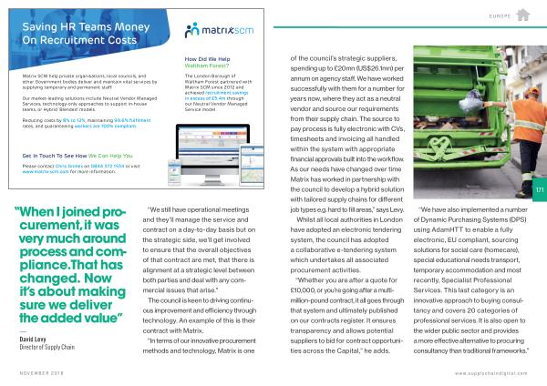 EUROPE of the council ’ s strategic suppliers , spending up to £ 20mn ( US $ 26.1mn ) per annum on agency staff . We have worked successfully with them for a number for years now , where they act as a neutral vendor and source our requirements from their supply chain . The source to pay process is fully electronic with CVs , timesheets and invoicing all handled within the system with appropriate financial approvals built into the workflow . As our needs have changed over time Matrix has worked in partnership with the council to develop a hybrid solution with tailored supply chains for different job types e . g . hard to fill areas ,” says Levy .