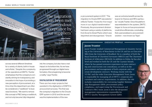 e-procurement system in 2017 . “ The migration to Oracle ERP was seismic ,” reflects Tranter . “ It was the first major move in our digital transformation .” Previously , the procurement division had been using a variety of platforms , from Excel to Great Plains which was disjointed and disorganised . “ Oracle was an extreme benefit across the board , for finance and HR in particular ,” recalls Tranter . Once the platform was embedded in the system , DWTC began to focus on how procurement could drive efficiencies , concluding that a personalised e-procurement solution – now known as Tejari