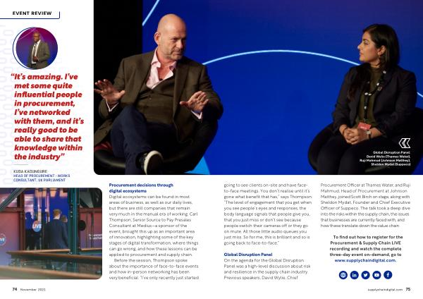 Procurement Officer at Thames Water , and Ruji Mahmud , Head of Procurement at Johnson Matthey , joined Scott Birch on stage , along with Sheldon Mydat , Founder and Chief Executive Officer of Suppeco . The talk took a deep dive into the risks within the supply chain , the issues that businesses are currently faced with , and how these translate down the value chain .