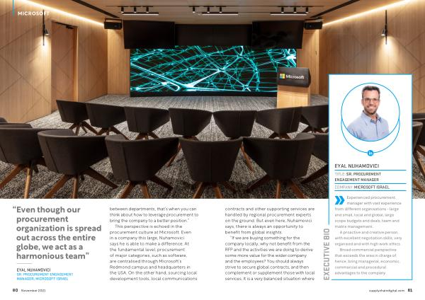 EYAL NUHAMOVICI SR . PROCUREMENT ENGAGEMENT MANAGER , MICROSOFT ISRAEL between departments , that ’ s when you can think about how to leverage procurement to bring the company to a better position .” This perspective is echoed in the procurement culture at Microsoft . Even in a company this large , Nuhamovici says he is able to make a difference . At the fundamental level , procurement of major categories , such as software , are centralised through Microsoft ’ s Redmond campus and headquarters in the USA . On the other hand , sourcing local development tools , local communications