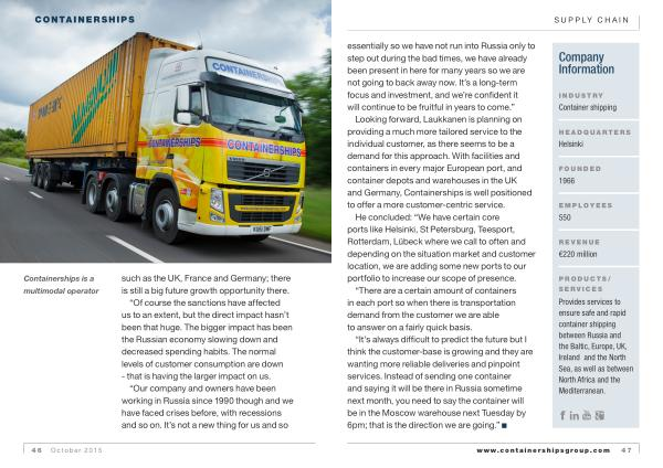 Looking forward , Laukkanen is planning on providing a much more tailored service to the individual customer , as there seems to be a demand for this approach . With facilities and containers in every major European port , and container depots and warehouses in the UK and Germany , Containerships is well positioned to offer a more customer-centric service .