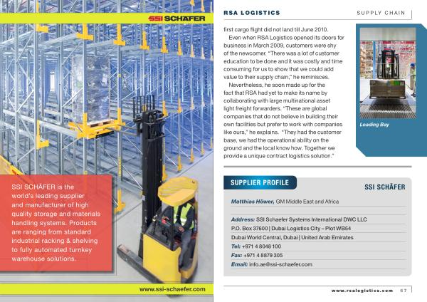 Address : SSI Schaefer Systems International DWC LLC P . O . Box 37600 | Dubai Logistics City – Plot WB54 Dubai World Central , Dubai | United Arab Emirates Tel : + 971 4 8048 100 Fax : + 971 4 8879 305 Email : info . ae @ ssi-schaefer . com www . rsalogistics . com 67