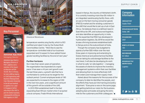 Abhishek Ajay Shah is Managing Director of RSA Logistics and a member of the board of directors at RSA TALKE . Born in Kenya , he took a MEng degree , in Civil Engineering with Business Management , from Warwick University in the UK and worked in logistics for a year in Singapore before returning to the UAE to join the family business , subsequently setting up