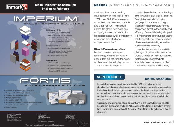 Inmark Packaging was incorporated in 1975 with a focus in the distribution of glass , plastic and metal containers for various industries , including : food , beverage , cosmetic , chemical and coatings . In the ensuing four decades , while our original focus remains a core aspect of our business , we have expanded greatly to meet evolving needs in the marketplace . Currently operating out of six ( 6 ) locations in the United States , one ( 1 ) location in Singapore and one ( 1 ) location in the United Kingdom , Inmark has distribution across North America , Asia , United Kingdom and South America . www . marken . com 85