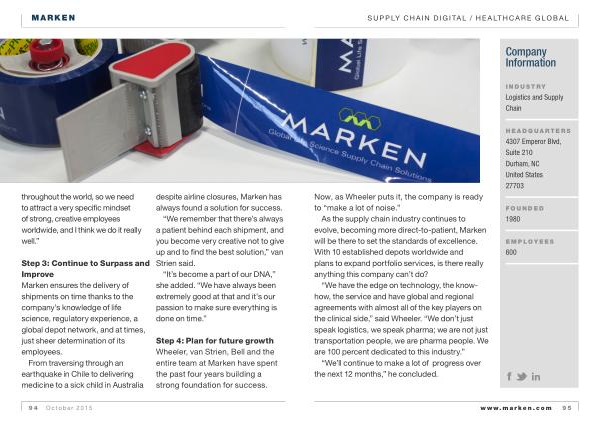 Step 3 : Continue to Surpass and Improve Marken ensures the delivery of shipments on time thanks to the company ’ s knowledge of life science , regulatory experience , a global depot network , and at times , just sheer determination of its employees .