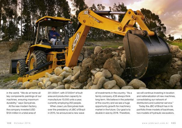 BRAZIL of investments in the country . “ As a family company JCB always think long term . We believe in the potential of the country and we see a huge opportunity growth for machinery market in the future . Our goal is to double in size by 2018 . Therefore , we will continue investing in location and nationalization of new machines , consolidating our network of distributors and customer service .”