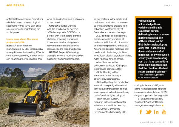 Learn more about the social projects of JCB : IESA : On each machine manufactured by JCB in Sorocaba , a soap kit manufactured by IESA , is sent accompanied by a letter , which aim to spread the word about this work to distributors and customers of the brand .