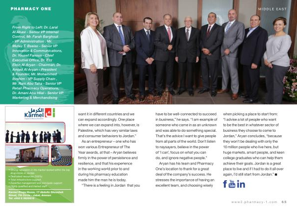 Aryan has his team and Pharmacy One ’ s location to thank for a great deal of the company ’ s success . He stresses the importance of having an excellent team , and choosing wisely when picking a place to start from : “ I advise a lot of people who want to be the best in whatever sector of business they choose to come to Jordan ,” Aryan concludes , “ because they won ’ t be dealing with only the 10 million people who live here , but huge markets , smart people , and keen college graduates who can help them achieve their goals . Jordan is a great place to live and if I had to do it all over again , I ’ d still start from Jordan .” www2 . pharmacy-1 . com 65