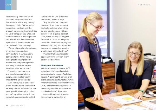 The Lyone Foundation With family values at its core , COS established the Lyone Foundation as an initiative to support Australian people . A generous 15 percent of all profits pour into the foundation , which means that when a customer chooses COS , “ they know that 15 percent of the money we make from the order is going to charity ”, Amie says .
