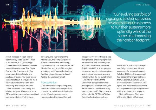 A Letter of Intent with the Ministry of Transportation ( MoT ) and Egyptian National Railways in the Middle East has also recently been signed by GE . The company will supply 100 GE ES30ACi Light Evolution Series Locomotives , which will be used for passengers and freight , as well as a 15-year agreement for technical support . Totalling $ 575mn , the agreement has become the largest between the two parties , signifying GE ’ s dominance within the market . The figure also encompasses technical training aimed at improving the skills of local engineers and workers .