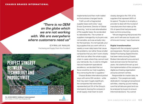 Digital transformation Aligned with the company ’ s growth and expansion , Romain Laclaverie , Global Purchasing Digital Director , has been restructuring Chassis Brakes International ’ s procurement tools and services for the last two years . He is behind the set-up and the implementation of the company ’ s digital purchasing organisation and procurement centres .