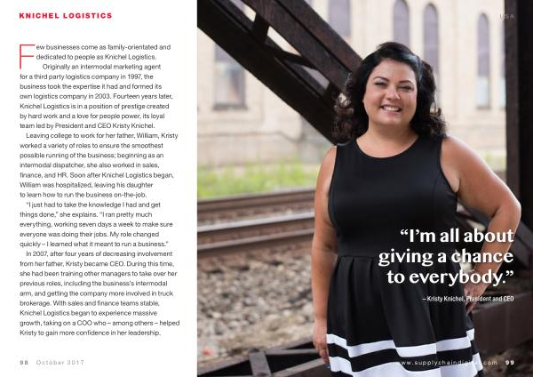 Leaving college to work for her father , William , Kristy worked a variety of roles to ensure the smoothest possible running of the business ; beginning as an intermodal dispatcher , she also worked in sales , finance , and HR . Soon after Knichel Logistics began , William was hospitalized , leaving his daughter to learn how to run the business on-the-job .